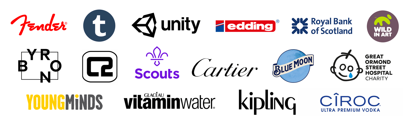 I've worked for a variety of clients including Fender, Mr Jones Watches, RockCorps, Unity, Tumblr, CIROC Vodka, Blue Moon, The Scouts, Vitaminwater, The National Gallery, Kipling, Lost Pier Brewing.